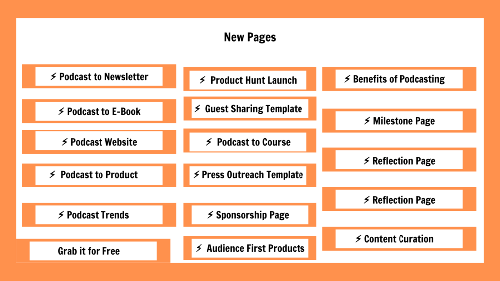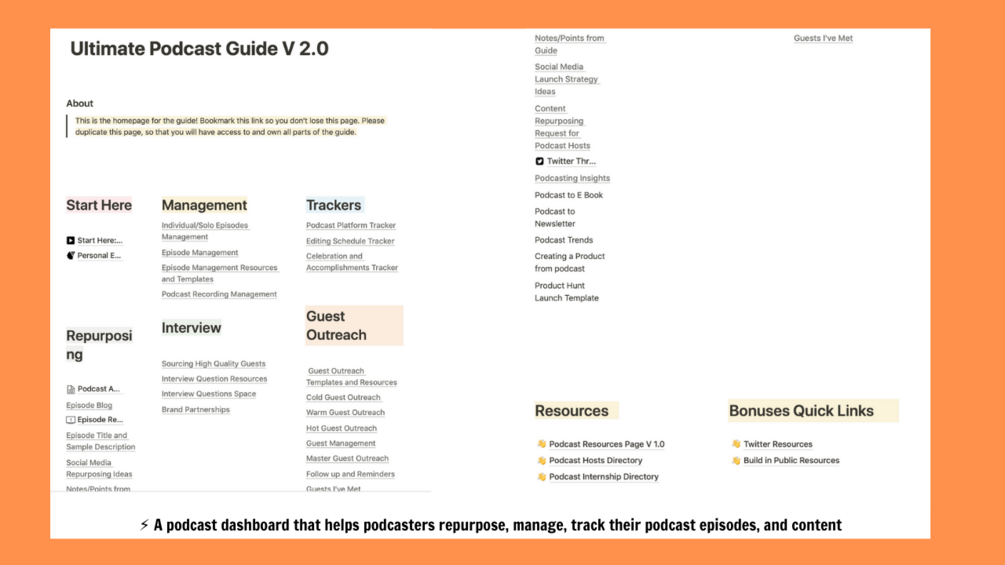 You can check out the new pages list here: https://charmed-guilty-d57.notion.site/Ultimate-Podcast-Guide-V-2-0-Waitlist-5a52f24c81944d6c946557893ea1da70